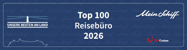 Durch die vertrauensvolle Zusammenarbeit mit TUI Cruises und durch das Feedback unserer Teilnehmer auf unseren Reisen mit der Mein Schiff-Flotte wurden wir als eines der Top-100-Reisebüros für 2026 ausgezeichnet.